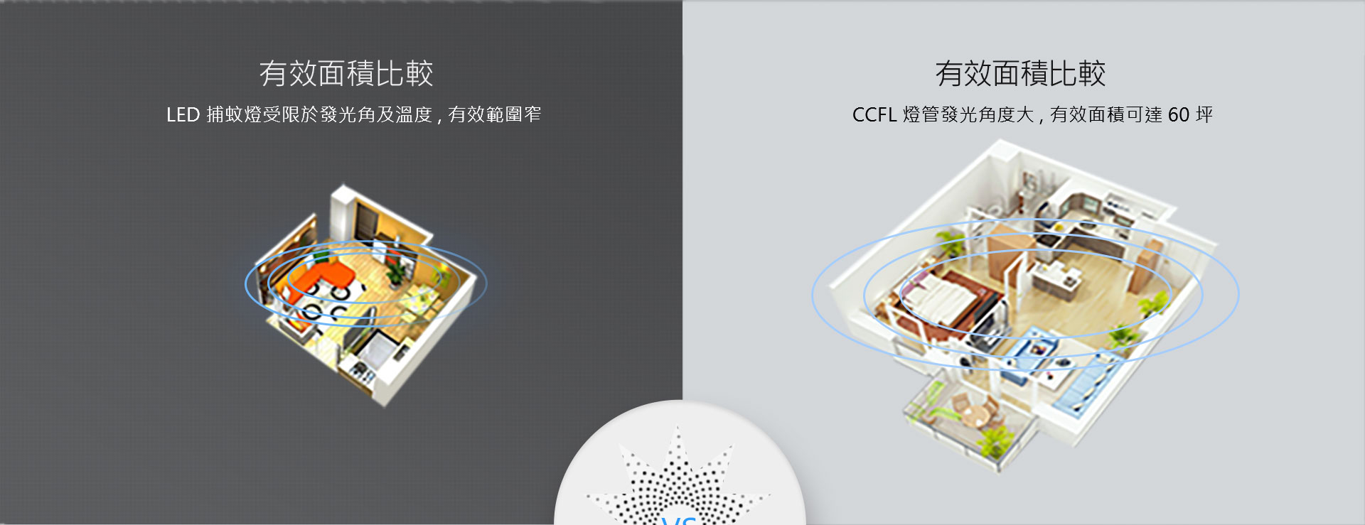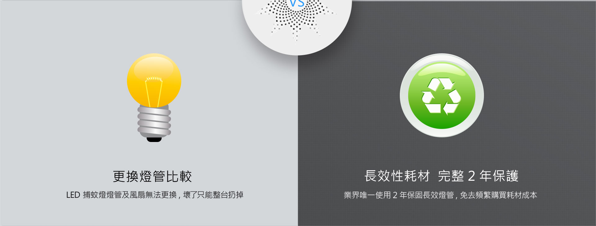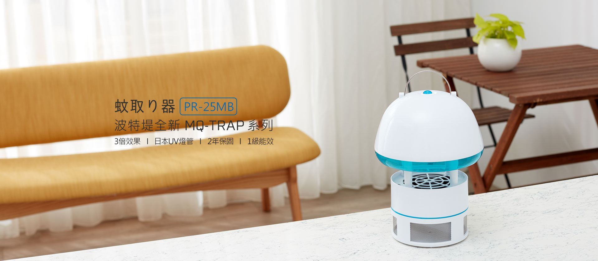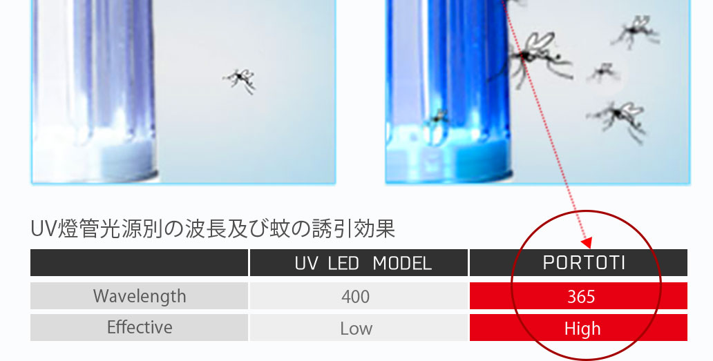 使用日本長效UV燈管, 利用蚊蟲對紫外線波長的喜好, 以光線、温度、氣味三方面誘引蚊蟲, 輕 簡式設計適合居家、辦公場所、餐廳、飯店等環境長時間使用, 無高壓電極火花使用最安心。