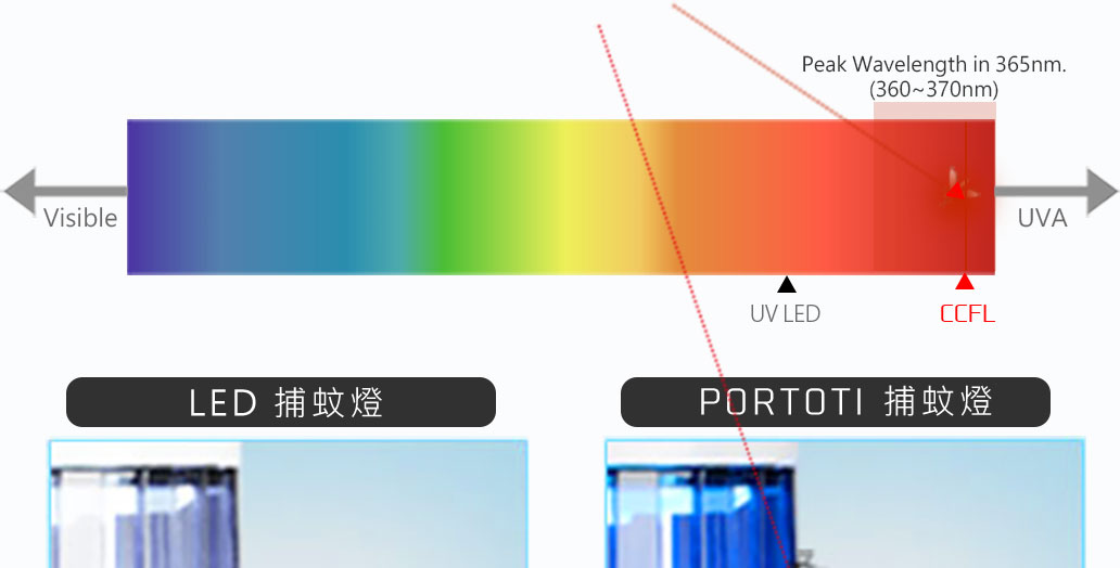 UV燈管以波長及燈管模擬人體溫度誘引蚊蟲